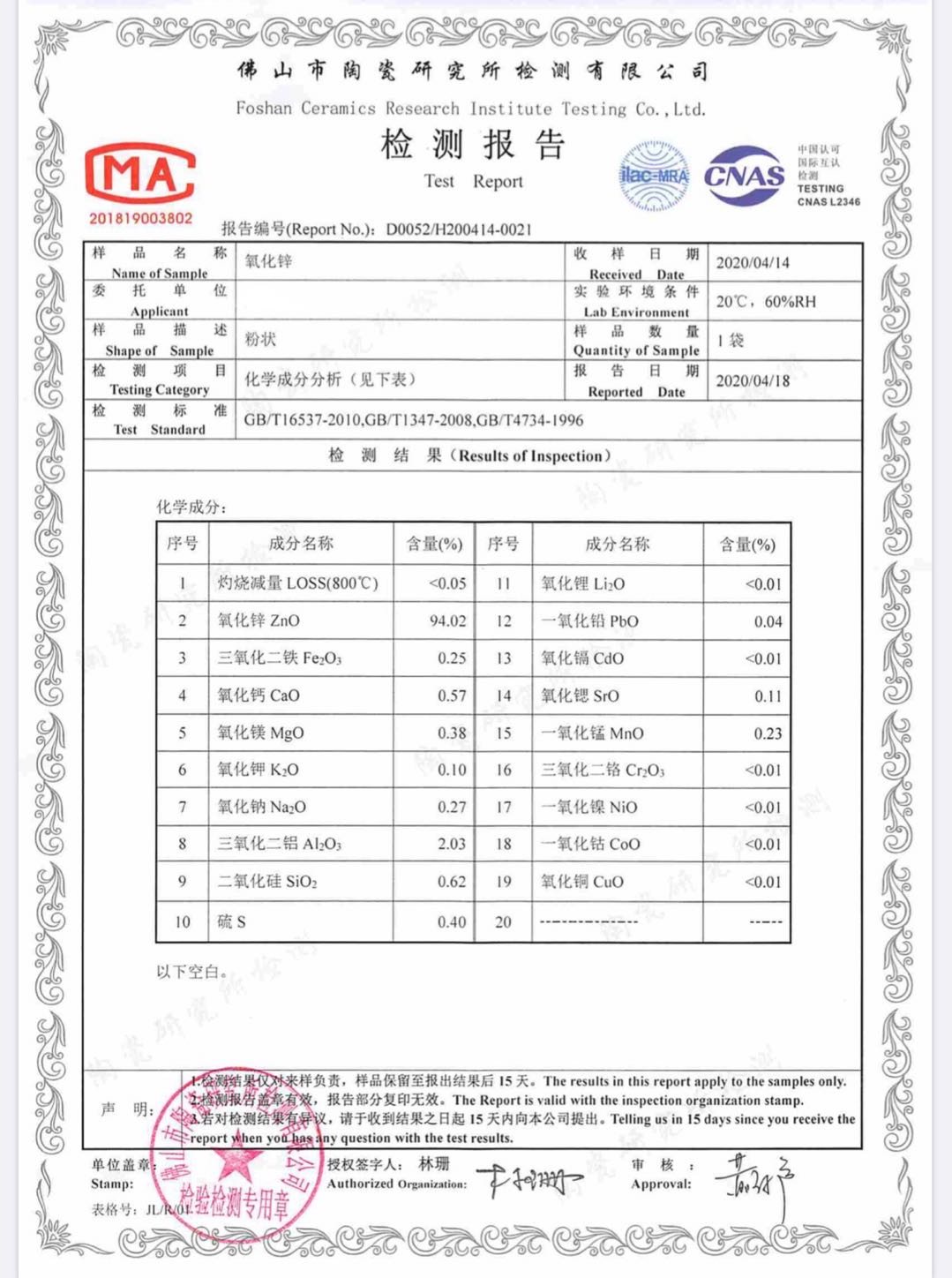 When the general zinc oxide is heated to 600 degrees, it will appear dark yellow and reach the active state. Our zinc oxide at room temperature is dark yellow, in the active state. It can instantly melt, high thermal conductivity, high activity, effectively reduce the glaze viscosity. The flow rate is 11.5 seconds, the glaze slurry is not thixotropic, and the flow rate is stable after a long time.